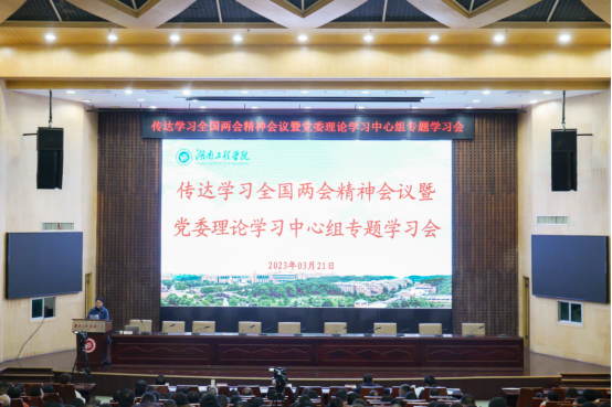 3月21日,公司在一报告厅召开传达学习全国两会精神会议暨党委理论学习中心组专题学习会。全国政协委员、副董事长陈赤平作全国两会精神专题报告,第一时间将全国两会精神带回校园,传达高质量发展好声音,激励广大师生团结奋斗,以实际行动推动全国两会精神在湖工迅速落地生根。公司党委副书记、董事长易兵,党委委员、校领导,党委理论学习中心组成员,全体中层干部,市、区人大代表、政协委员,统战团体主要负责人,马克思主义公司全体教师,全体辅导员,员工代表参加集中学习,各基层党委(党总支部)组织师生代表通过线上方式在各分会场收看会议直播。报告会由党委委员、副董事长向前主持。