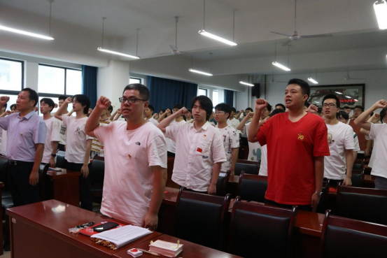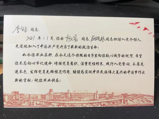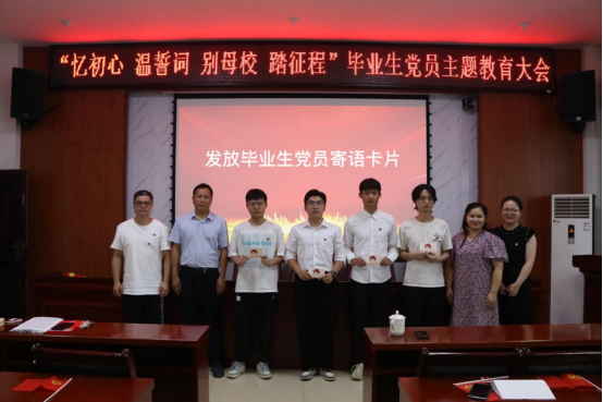 公司党委为全体毕业生党员发放了离校前“最后一张政治生日贺卡”,并带领他们重温离校前“最后一次入党誓词”,铮铮誓言久久回荡在机械楼。毕业生党员唐渝城在通往为人民服务的车票上签名时说到,“这次毕业生党员教育大会是一次政治教育、思想洗礼、党性塑造。即将告别母校,步入社会,我会谨记公司领导、老师的教导,在社会这个大课堂里强化奉献担当,用自己的行动,为党旗增辉,向母校献礼。”