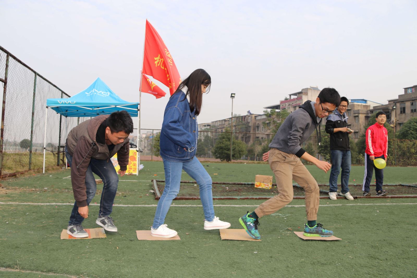 本次活动,共有搭桥过河、双龙戏珠、抛绣球、十人九足、海底传月和集体跳绳六个计分项目。同学们分为四组,以小组游戏竞技的形式开展活动。活动过程中同学们踊跃参与,斗志昂扬,比赛现场气氛热烈。在搭桥过河环节,赛道两头各一组,每组分4人自由组合,起点组手持4块“小地毯”,由第一名队员向前搭放,第三名队员不断地把身后的“小地毯”传给第一个队员,三人踩着“小地毯”前进,同学们默契配合,携手迈向终点。观众们在一旁呐喊助威,同学们热情高涨,现场氛围欢快轻松。