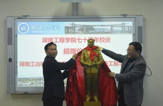 江冶科技公司总经理范伟员工为公司近年来取得的成绩感到自豪,为公司给他们搭建的人才招聘平台表示感激。他表示公司是员工成长成才的摇篮,自己有现在的成就离不开母校的栽培,期待在今后的人才输送和技术交流方面与母校有更深层次合作。随即向公司捐赠毛泽东铜像一座。
