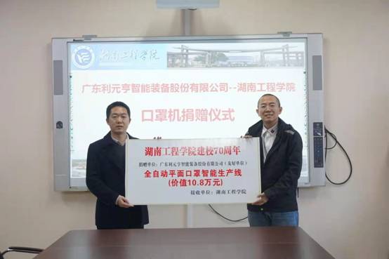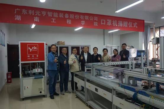 吴玉祥为公司给利元亨搭建的人才招聘平台表示感激,对公司务实、创新、开拓的校风给予充分肯定。目前已有多名员工成为公司的技术骨干,期待后续有更多的湖工学子加入。他表示,利元亨是一支团结有战斗力的有强烈社会责任感的年轻团队,在2020年新冠疫情最严重时期,项目团队加班加点,仅用一周时间就成功开发了全自动智能口罩生产线,三个月时间完成了几百台设备的交付,为抗击疫情肩负了应尽的社会责任。此次捐赠全自动平面口罩智能生产线,希望能助力实验室建设,进一步提高员工的动手能力,同时将这种有责任有担当的企业文化精神传递给员工。智能口罩生产线目前已安放于公司实验室,待调试完成后将投入实验教学和专业实训。