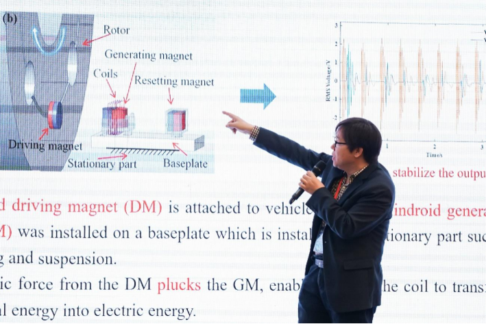 会议主题报告环节,围绕“振动”和“能量俘获”两个关键词,密西根大学、安娜堡分校教授左磊,香港理工大学教授严晋跃、英国南安普顿大学副教授Daniil Yurchenko、西北工业大学航空公司教授周生喜、哈尔滨工业大学(深圳)教授陈立群、法国里昂国立应用科学公司教授Mickaël LALLART、加拿大工程院院士、香港理工大学机械工程系首席教授成利、东京大学教授Kimihiko Nakano、英国巴斯大学教授Chris Bowen分别以《Biomechanical energy harvesting for wearables and portables》《Trends and Needs of Future Energy R&D》《Future of high-performance energy harvesters through global devices optimization》《Nonlinear vibration energy harvesters subjected to various excitations》《Integration of vibration reduction and energy harvesting for a satellite with an adapter》《Nonlinear conditioning circuits for piezoelectric energy harvesters: from principles to applications》《Vibration energy manipulation through nonlinear electromechanical coupling-enhanced acoustic black hole effects》《Self-powered Active Suspension and Energy》为题做学术报告。
