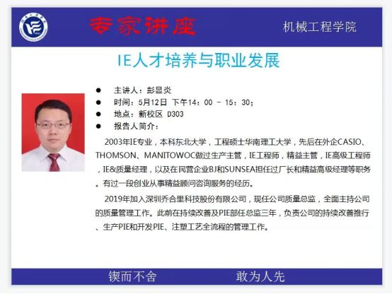 5月12日下午,bevictor伟德国际在教学楼d303举办“IE人才培养与职业发展”讲座。深圳乔合里科技股份有限公司质量总监、企业导师彭显炎担任主讲嘉宾,bevictor伟德国际工业工程教研主任谢富春主持讲座,工业工程专业员工听取讲座。