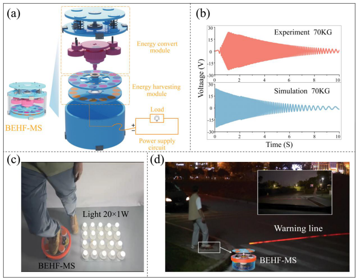 研究以“Bidirectional energy harvesting floor with magnetic suspension for selfpowered traffic management”为题发表于国际能源领域权威期刊《Energy》上,提出了一种新型的双向能量采集地板(BEHF-MS),采用磁悬浮技术,实现自供能交通管理。该系统将行人踩踏激励转化为磁悬浮飞轮的稳定单向旋转,其复位机制确保运动持续保持在相同方向。通过电磁感应原理,利用永磁体和固定线圈将旋转的动能转化为电能。研究开发并实验验证了动态模型,模型包含能量转换模块中末端齿轮的动态方程、能量采集模块中飞轮盘的旋转动力学以及电磁感应原理。研究表明,在单次激励下,BEHF-MS的峰值输出为23.60 V,输出持续时间随着行程长度和行人体重的增加而上升。原型测试表明,单次行人踩踏能够为20个LED灯泡(每个1 W)提供大约14秒的电力。在实际场景应用中,展示了自供能行人过街警告系统,凸显了该系统在提高城市安全性和可持续性方面的潜力。研究结果表明,BEHF-MS是智能城市和交通基础设施中一种有前景的环保能源解决方案。关汗青副教授为第一作者,指导的硕士生褚盛贵为第二作者。邹鸿翔教授和上海交通大学赵林川博士为通讯作者。